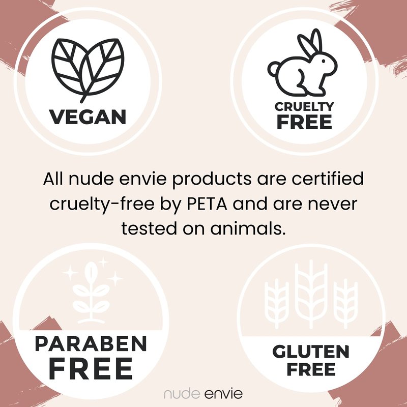 - Certified Vegan, Cruelty-Free, and Paraben Free- Nude Envie is carefully crafted using the finest ingredients. All products are certified vegan, cruelty-free, paraben-free, and gluten-free.