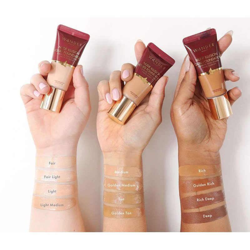 What it Does: This weightless liquid foundation delivers an undetectable finish that makes blemishes, redness and discoloration disappear. With buildable coverage, this foundation delivers a natural, radiant, skin-like finish. Designed in a travel-friendly tube with a doe-foot applicator to deliver multitasking coverage wherever you wander. 8-in-1 Multitasking Foundation: Delivers medium-to-full buildable coverage Can be applied and blended all over as foundation Is designed with a doe-foot applicator for targeted spot correcting and concealing Reduces the appearance of wrinkles and evens skin tone with niacinamide Balances sebum production and improves the elasticity of skin with lotus extract Can be used as contour; simply choose a shade 1-2 darker than your skin tone Can be used as concealer; simply choose a shade 1-2 lighter than your skin tone Has a tube that is perfectly portable and maximizes every last drop of the formula How to Use To use as nude foundation, use the doe-foot to apply from the center of the face outward. Blend with fingertips, beauty sponge, brush or tool of choice. For maximum coverage, swipe doe-foot all over face and buff onto skin from the center of the face outwards. To target imperfections, dab doe-foot precisely and directly onto skin and blend. For customized coverage, squeeze the tube slightly and mix with face oil or moisturizer for a look that’s all your own.