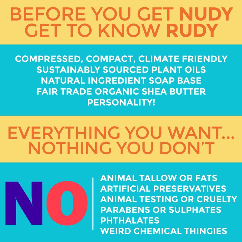 - Everything You Want & Nothing You Don't: NUDY RUDY soap bar pucks are made in Australia using ingredients that are good for your body. Our scents are specially formulated with no harsh ingredients and are paraben-free, sulfate-free & cruelty-free.