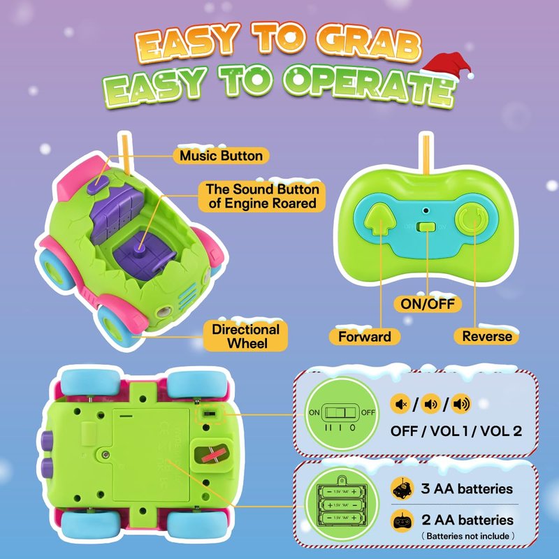 - 【Easy To Control】The cars are easy to control through 2 big directional buttons to move forward and backward. 3 fun musics can be change or pause by pressing the music button.The toddler remote control car requires 3 AA batteries and the remote control requires 2 AA batteries(not included). Place the batteries in both vehicles and controllers and watch your toddlers have endless fun