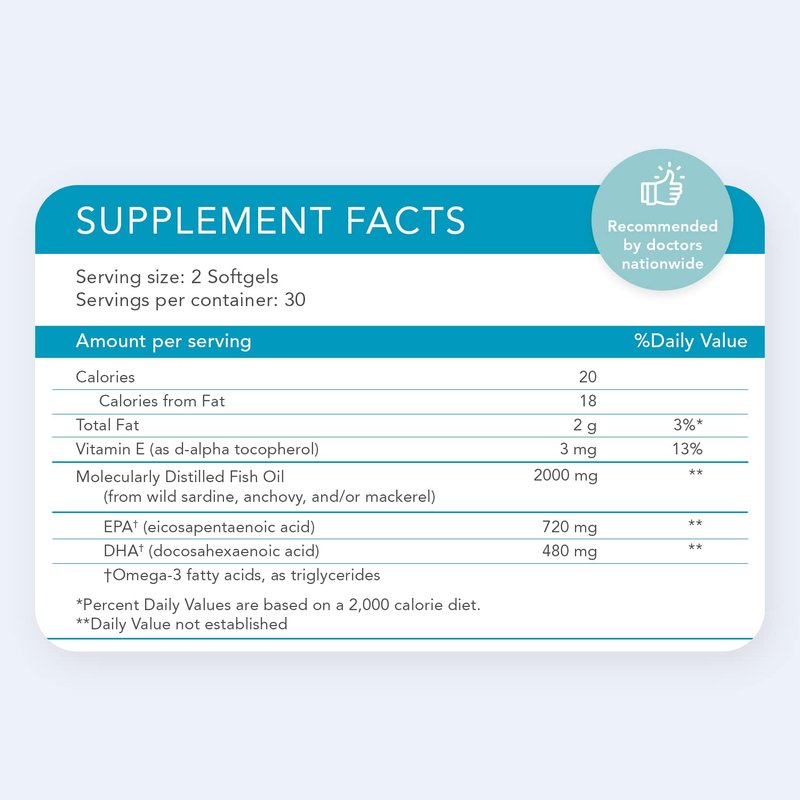 - WHAT YOU GET: Premium-quality heart, joint, vision and brain fish oil supplements that are manufactured and quality controlled in an FDA-registered laboratory. Available in 30-day supply bottles, each with 60 capsules. To deliver complete health protection, we recommend a daily dose of 2 capsules preferably at bedtime or with food. All fish oil softgels feature a protective coating with a hint of vanilla that minimizes the incidence of oil reflux, AKA. no fishy burps