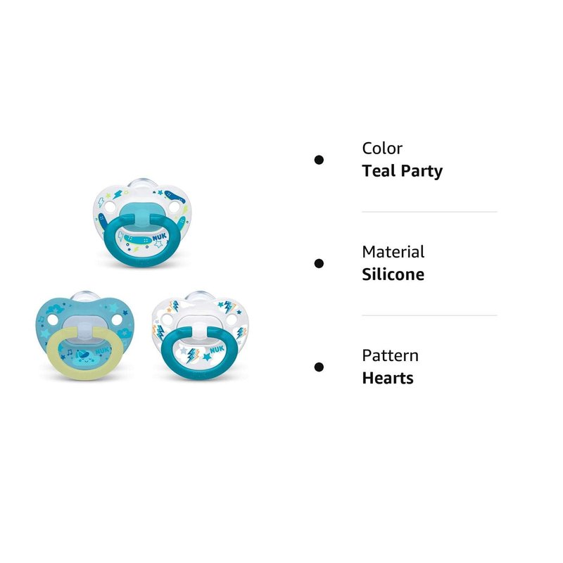 Having a difficult time finding the right pacifier for your baby? The NUK Value Pack provides 3 different pacifiers in one package. Like all NUK pacifiers, the Value Pack features the improved NUK orthodontic nipple shape. Invented over 60 years ago by pediatric dentists and doctors, the NUK pacifier is modeled after the natural shape of mom’s nipple while breastfeeding. This makes for an easy transition from breast to pacifier and back. The asymmetrical nipple naturally fits baby’s palate and is now improved to allow for more room for a natural sucking motion, reduce pressure on teeth and jaw, and helps prevent teeth misalignment. The NUK heart-shaped shield fits perfectly under baby’s nose for easier breathing and prevents irritation. With a convenient glow-in-the-dark feature to help you find lost a pacifier during the night, this pack of 3 orthodontic pacifiers is ideal for your child aged 0-6 months. (*Based on Market Research, 2017, tested with 307 pacifier users).