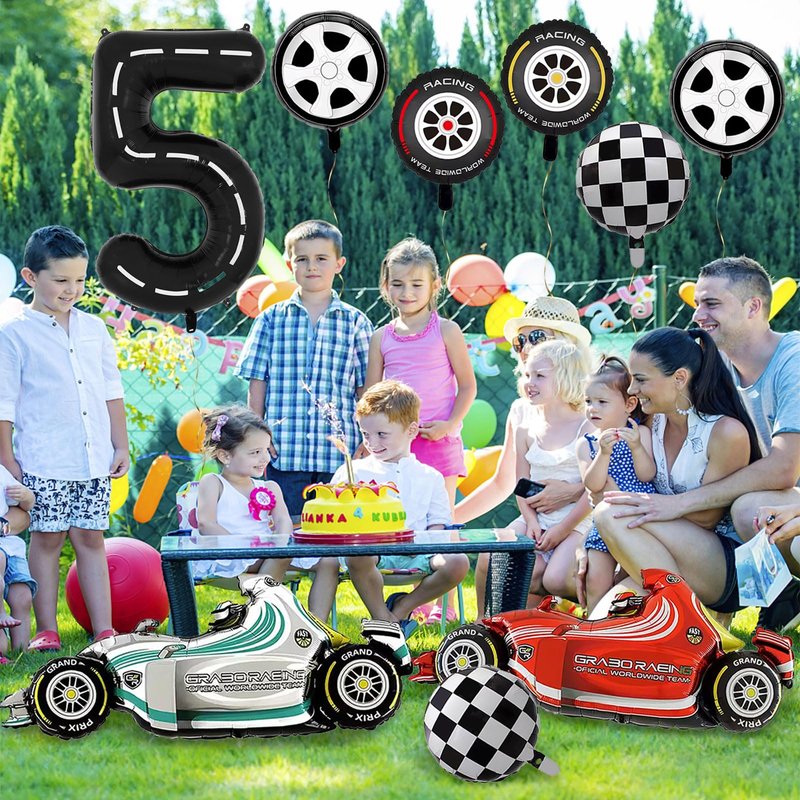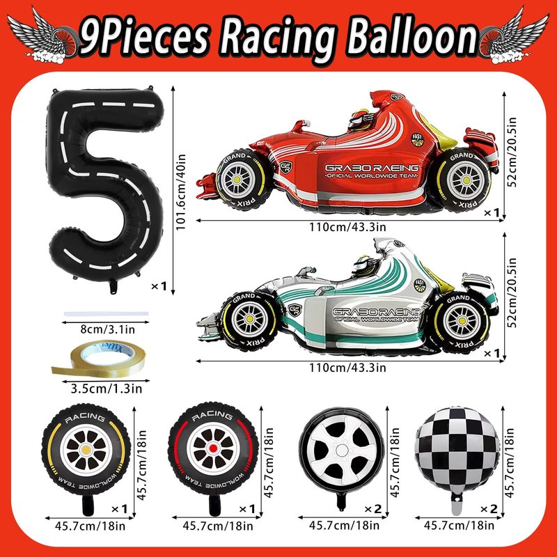 - PACKAGE INCLUDES - You will get 9 giant size race car balloons - 2pcs F1 racing balloons, 2pcs racing tires balloons, 1pc number 5 balloon, 2pcs sports car tires balloons, 2pcs racing checkered balloons, as well as straw and ribbon. Large sizes and sufficient quantity can meet your party decoration
