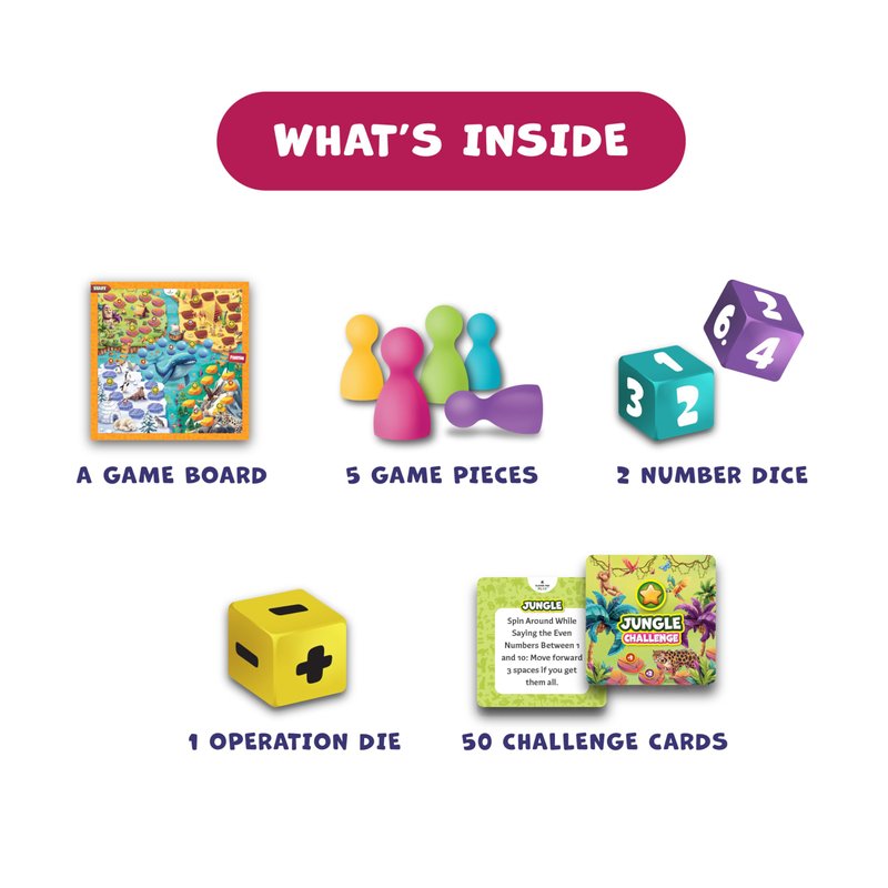 - WHAT’S INCLUDED – This math board game comes with a vibrant game board, five colorful game pieces, two number dice, one operation die, and fifty challenge cards for endless math adventures.