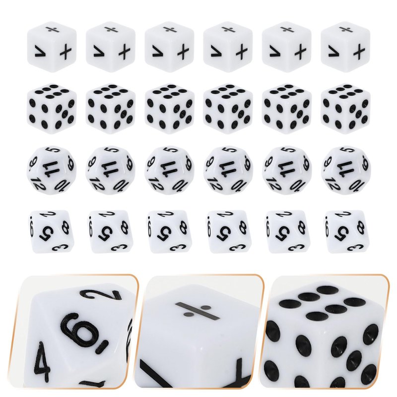 - Package Included: There is totall 24pcs teaching dice ( 6 pieces math operation dice+ 6 pieces 6- sided dot dices+ 6 pieces 10- sided number dices+ 6 pieces 12- sided dot dices )
