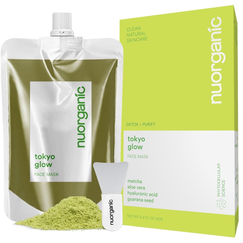 nuorganic Tokyo Glow Face Mask, with Aloe Vera, Japanese Green Tea, Guarana Seed, Hyaluronic Acid & Kaolin + Bentonite Clay. Soothes, calms and moisturizes skin, for an energizing and toning effect.