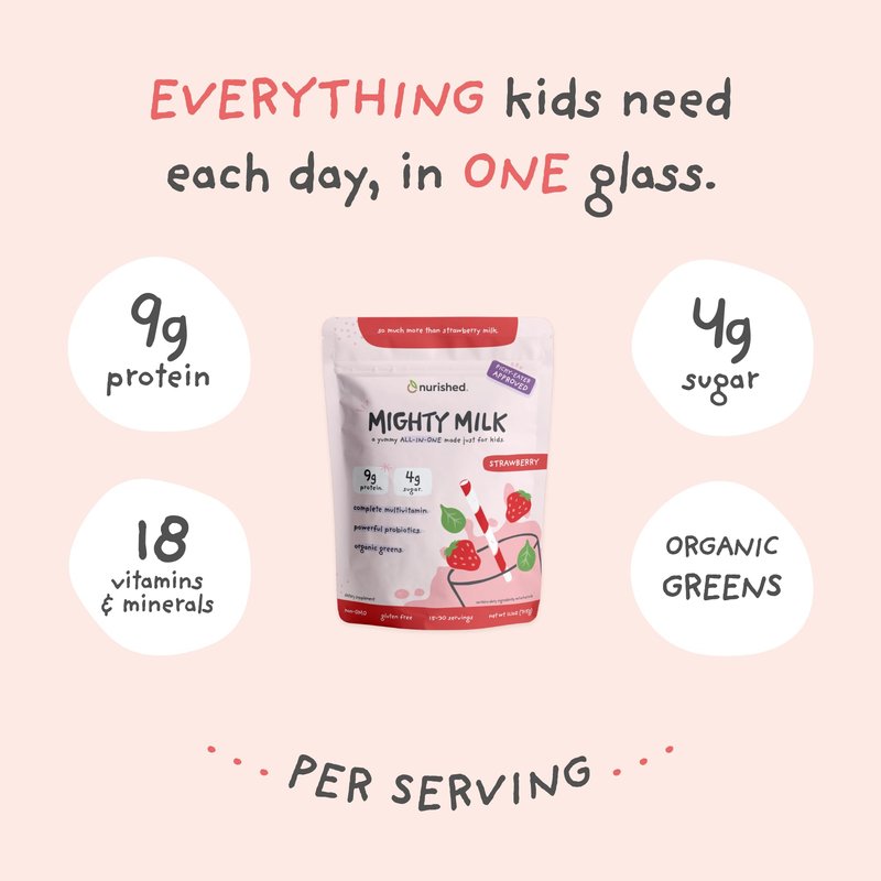 Nurished Mighty Strawberry Milk - Kids All-in-One Daily Protein Powder & Multivitamin Boosted with 2 Billion Probiotics & Organic Spinach - Natural Flavors, Colors & Sweeteners - 15-30 Servings