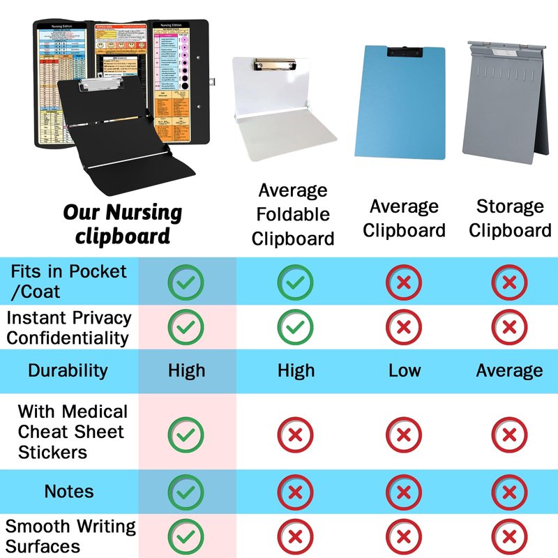 - 【Easy to Use】Our nursing clipboard comes up with free cheat sheets, which are wrapped individually , you can DIY it, anyone can use our clipboard even you are not doctors or nurses! the foldable clipboard can hold up to 50 pieces of sheets and secure all your documents. No more uncomfortable notebooks now that you have everything on display! Any problem, please feel free to contact us. We will get back to you within 24 hours for any issue.