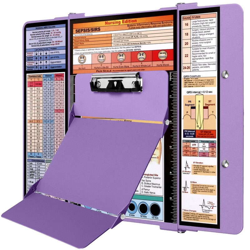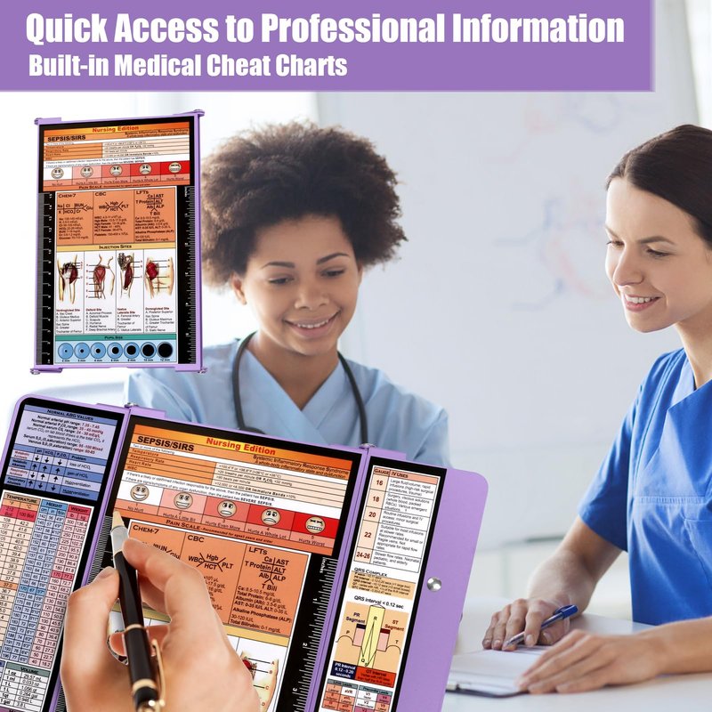 Nursing Clipboard Foldable,Nurse Clipboard 3 Layers Aluminum w/Nursing Medical Edition Cheat Charts, Foldable Nursing Clipboard w/Low Profile Clip,Pocket Clipboard for Students/Nurses/Doctors,Purple