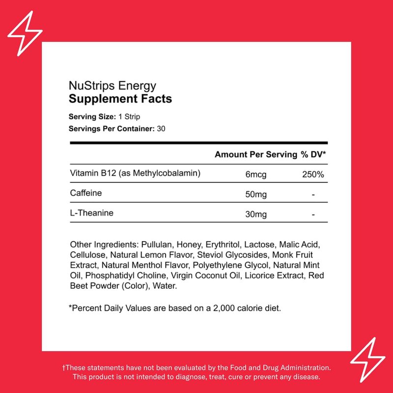 NuStrips Energy | Natural, Instant Energy Strips with 50mg Caffeine, L-Theanine, Vitamin B12 | 30 Energy Strips = 30 Energy Drinks | 5X Faster Absorption