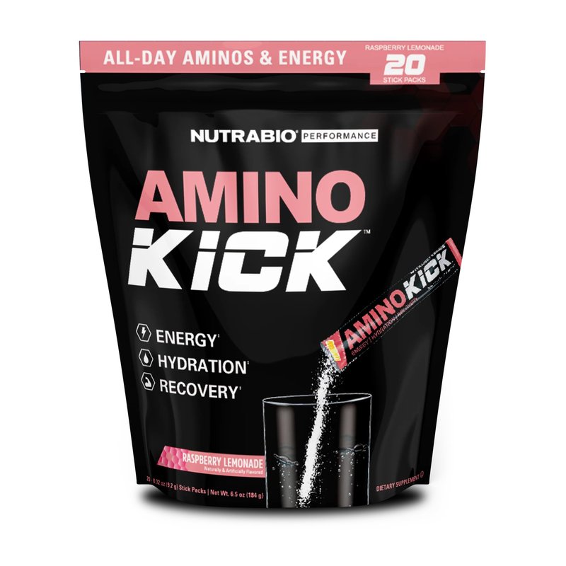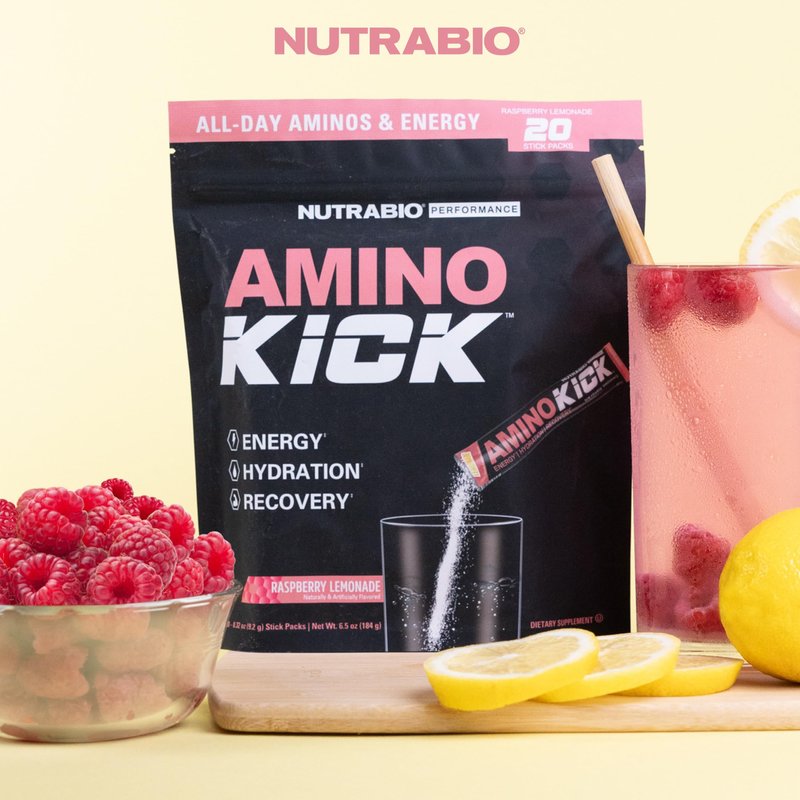 NutraBio – Amino Kick – All in One Performance Formula Energy, Hydration, Recovery 20 Servings, (Raspberry Lemonade) – 6g Amino Acids – Support Muscle Building