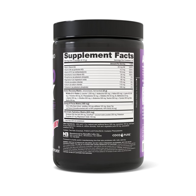 NutraBio Amino Kick - Amino Acid Energy Formula - BCAA's, Electrolytes for Hydration, Natural Caffeine- 30 Servings (Grape Berry Crush)