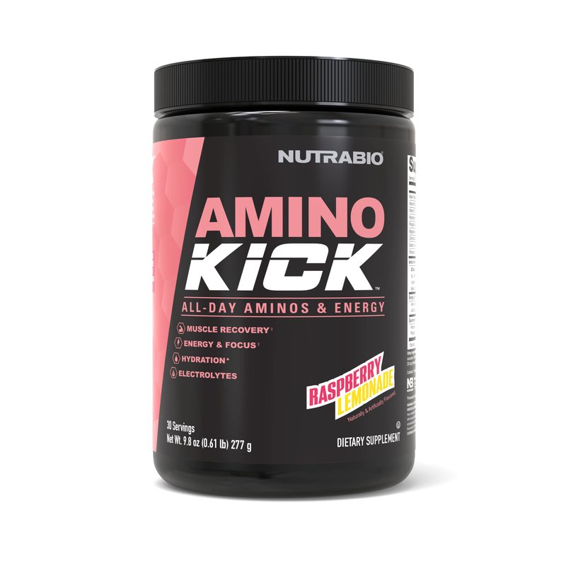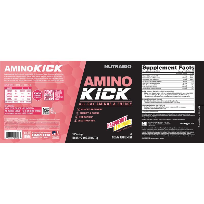 NutraBio Amino Kick - Amino Acid Energy Formula - BCAA's, Electrolytes for Hydration, Natural Caffeine 30 Servings (Raspberry Lemonade)