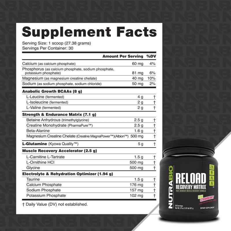NutraBio Reload - Powerful Muscular Recovery Formula - Post-Workout Supplement - 3G Creatine - 8G BCAAs - 5G Glutamine - 30 Servings, Kiwi Strawberry