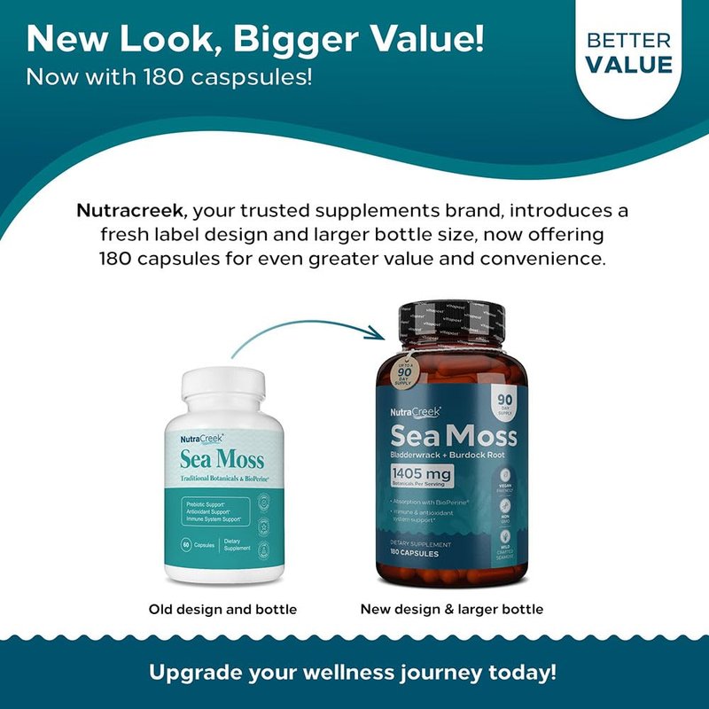 NutraCreek Sea Moss | Irish Sea Moss Capsules with Bladderwrack, Burdock Root & BioPerine for Absorption. Prebiotic & Immune Support | 90 Days Supply of Bladderwrack and Sea Moss Pills - 180 Capsules