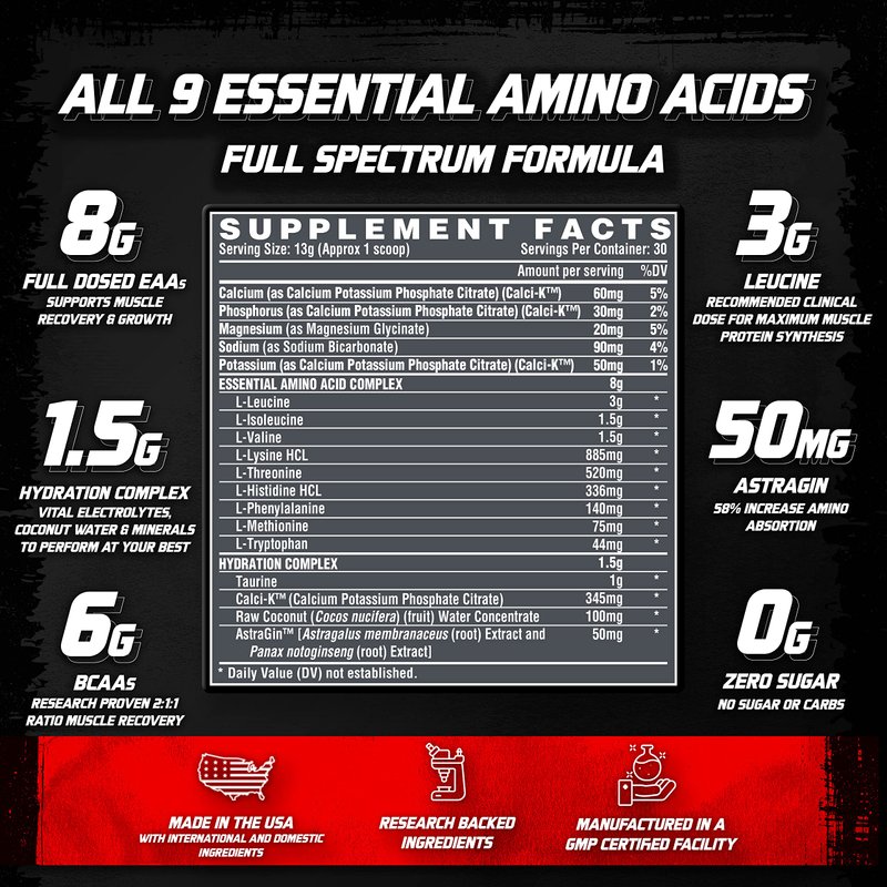 - BEST EAA SUPPLEMENT: Not only is this a full spectrum EAA profile consisting of all 9 Essential Amino Acids but it also contains 6g of BCAAs making this a superior advanced recovery intra and post workout product compared to the stand alone BCAA supplement
