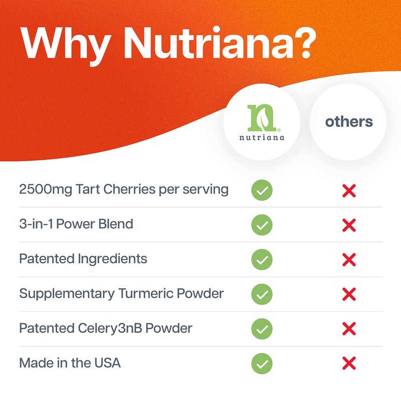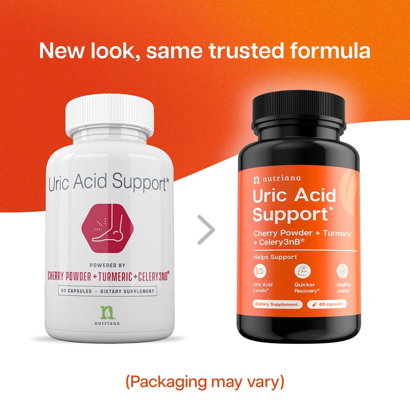 Nutriana Uric Acid Support is the only uric acid formula on the market that combines the three most powerful ingredients nature has to offer. This uric acid supplement is a potent blend of pure tart cherry extract, celery seed extract & turmeric formulated into one amazingly effective formula! Unlike most uric acid supplements that contain a limited amount of active tart cherry, our tart cherry supplement & uric acid reducer contains an impressive 2500 mg of powerful cherry tart antioxidants that truly deliver results. Our uric acid supplements contain a combination of potent ingredients that work synergistically to promote uric acid flush while enhancing uric acid metabolism. This joint support supplement is specially formulated to provide joint support while accelerating recovery processes. With regular use of our uric acid support, you'll notice an improvement in your joint mobility & flexibility. Made in the USA & is GMP-compliant. Non-GMO, Vegan & Gluten-free.