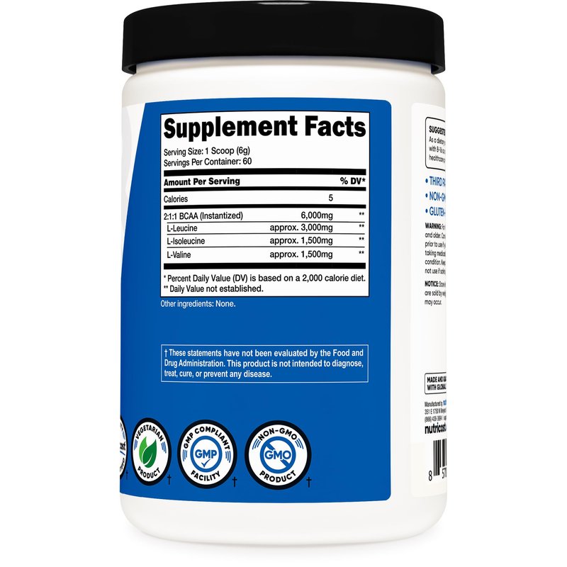 Nutricost BCAAs are vegan friendly, non-gmo, gluten free and 3rd party tested by iso-accredited laboratories. They are made in a GMP Compliant, FDA Registered Facility.