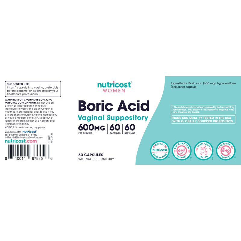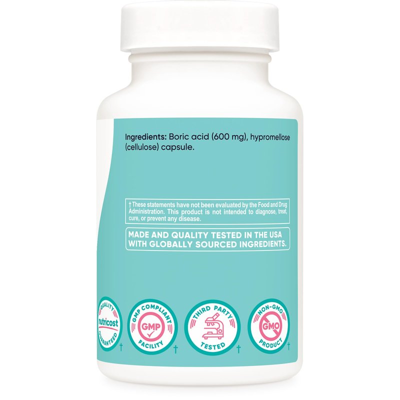 NOT FOR ORAL CONSUMPTION; For vaginal use only. Nutricost Boric acid is a vaginal suppository containing 600mg of boric acid per capsule. Each bottle contains 60 Capsules. They are non-gmo and plant-derived capsules.