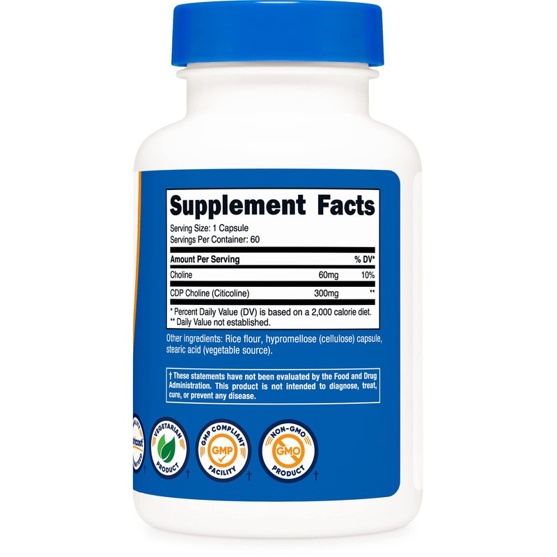 Nutricost, located and headquartered in the USA, only uses the best ingredients to ensure maximum quality and to help you feel your best! High Quality CDP Choline (Citicoline) 300mg per serving as a dietary supplement, take 1 capsule daily with 8-12 oz of water or as directed by your healthcare professional. For healthy individuals 18 years and older. Consult a healthcare professional prior to use if you are pregnant or nursing, taking medication, or have a medical condition. Keep out of reach of children. Do not use if safety seal is broken or missing.