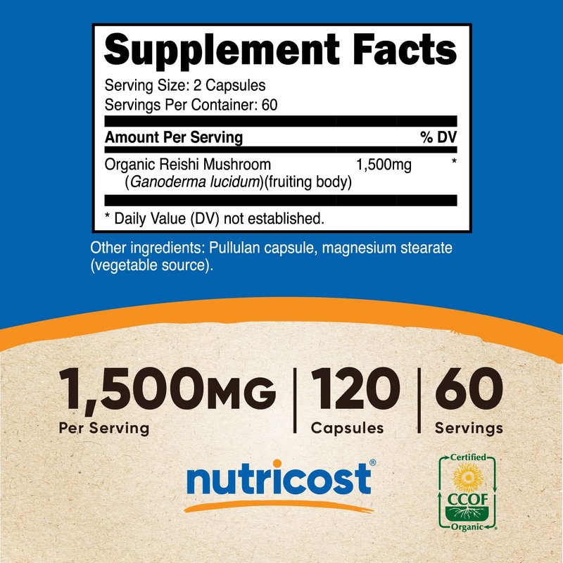 Unlike many similar products, Nutricost Reishi Mushroom has been certified Organic by CCOF. Look for the certification on the bottle. There is 750mg of Organic Reishi Mushroom per capsule for 1,500mg per serving. There are 120 vegetarian capsules - 60 Servings In each bottle. This product is non-gmo, gluten free, soy free, non-gmo, and vegetarian friendly. Easily add reishi mushroom to your daily regimen. Only What You Need, Nothing You Don't! We've simplified our entire philosophy down to that single concept. This motto is what drives us to find the highest quality sources of the purest ingredients for each supplement we offer. From single ingredients to our simple formulations for targeted effects, each of our supplements stays clear and simple with what they provide.