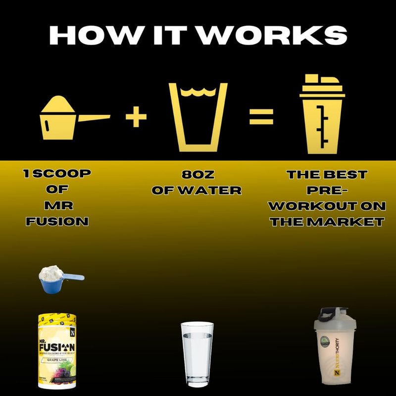 GET THE BEST OUT OF YOUR WORKOUT WITH MR.FUSION PRE WORKOUT BY NUTRITHORITY! Build your strength and increase your gains with our advanced pre workout formula with scientifically backed ingredients like Nitrosigine, Beta Alanine, Citrulline, and Betaine. Only available in delicious flavors, 1 scoop of Mr.Fusion will propel you through any workout without the worries of crashing afterward! Available for any athlete wanting to get the best out of their workout, whatever that workout may be! Whether it’s weightlifting, running, jogging, biking, sports, hiking, rock climbing, etc. Mr.Fusion will make the perfect pre workout! Package Contents: (1) Bottle of Mr.Fusion Pre Workout Product Details: Size: 25oz PET Bottle Serving Size: 1 Scoop Servings Per Container: 40 Peak Focus & Performance Elevation At Nutrithority, we stand for nothing but the best. Our premium Mr.Fusion pre workout increases your energy, focus, and strength to a degree unparalleled by the competition. Add 1 serving to 8-10 oz of water 10-15 minutes before your workout to feel the amazing effects of Mr.Fusion.