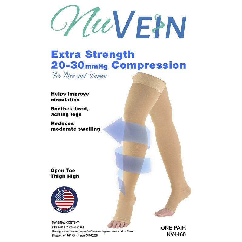 - NuVein graduated heavy strength 20-30 mmHg Hosiery; Unisex opaque fabric; Conceals while it heals