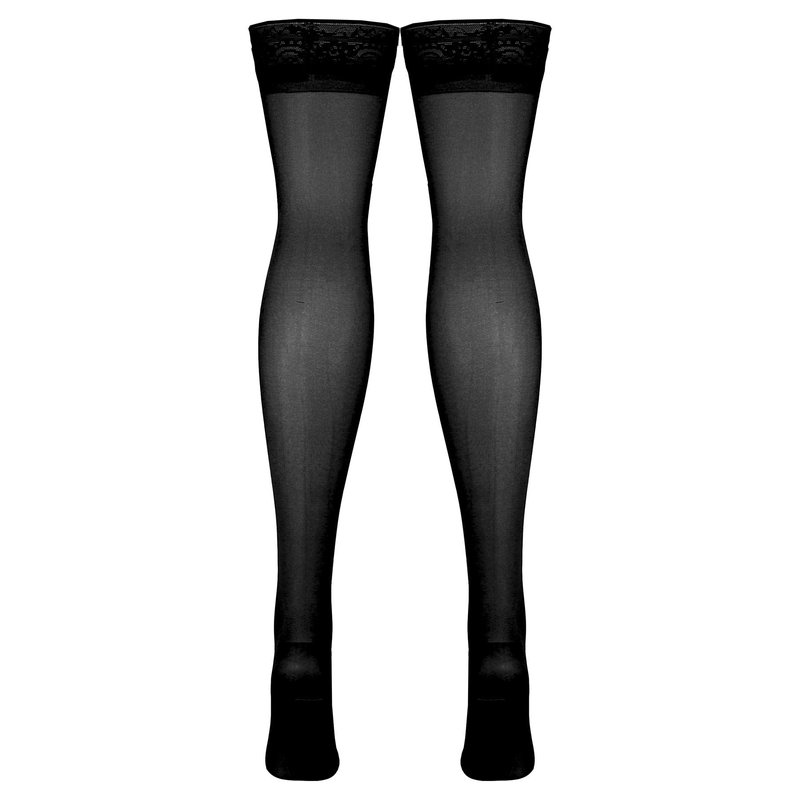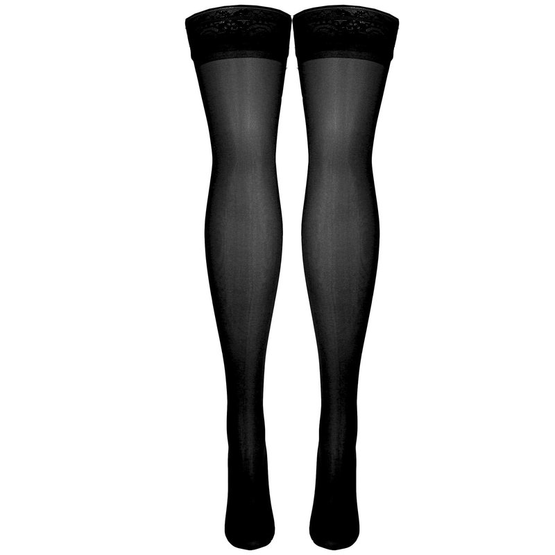 - Closed Toe foot; Above knee mid-thigh length; Lace top grip lined band prevents hosiery falling down