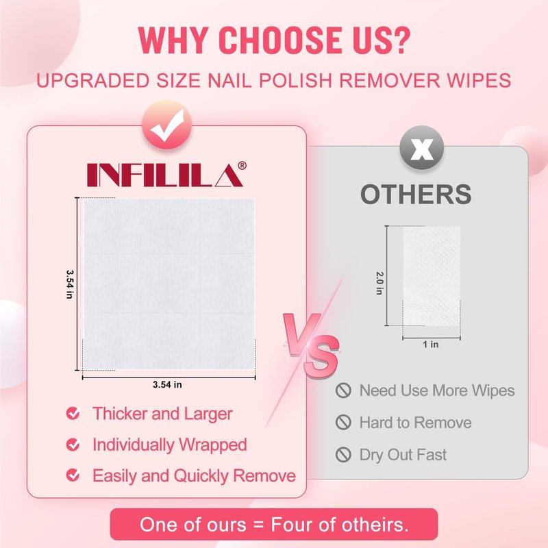 - COST-EFFICIENT: Larger and thicker lint free nail wipes (3.54*3.54in). Our nail polish remover wipes are potent enough to lift away all the polish on your fingers with a single pad only. Save money and nail care products with NXJ INFILILA wipes