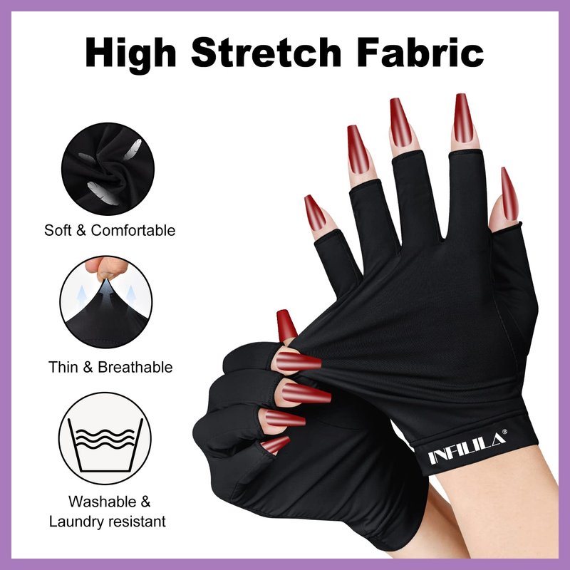 - Machine-washable & reusable: NXJ INFILILA UV gloves are machine washable and quickly dry, save your cleaning time. Multiple washings do not affect UV protection. We recommend you to wash the gloves before first use to avoid leaving any lint on your nails.