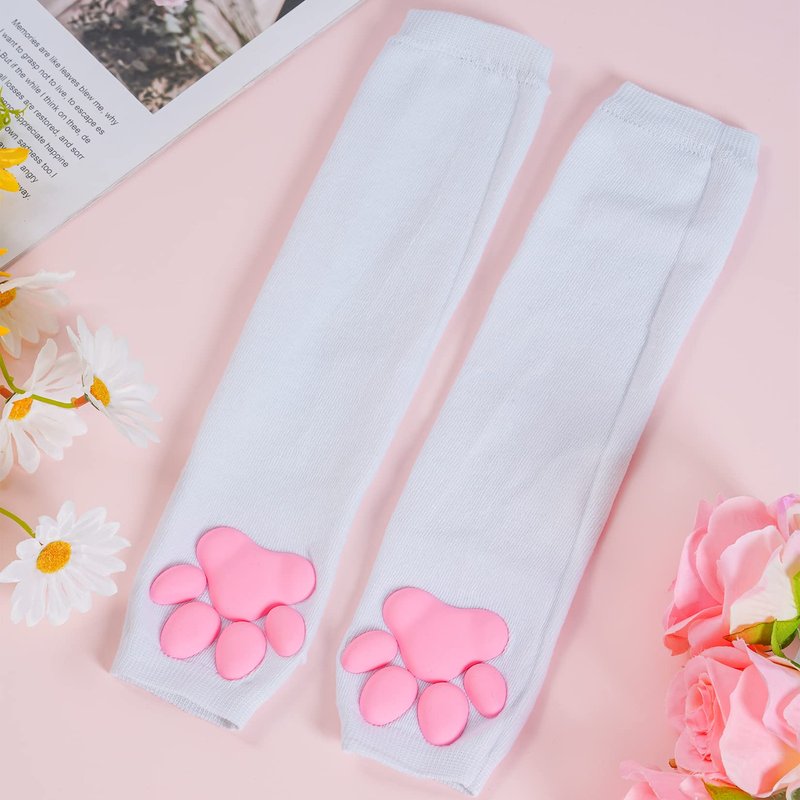 Nydotd Cat Paw Pad Mittens Gloves Kawaii Pink 3D Claw Fingerless Cute Cat Cosplay Gloves Sleeve for Girls Halloween Party (White, Long)