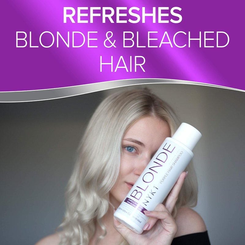 NYK1 PURPLE SHAMPOO contains effective purple & violet pigments and is designed for blonde, bleached, gray, super-lightened or de colored hair. For your clean, refreshed platinum, white, ash colored hair.