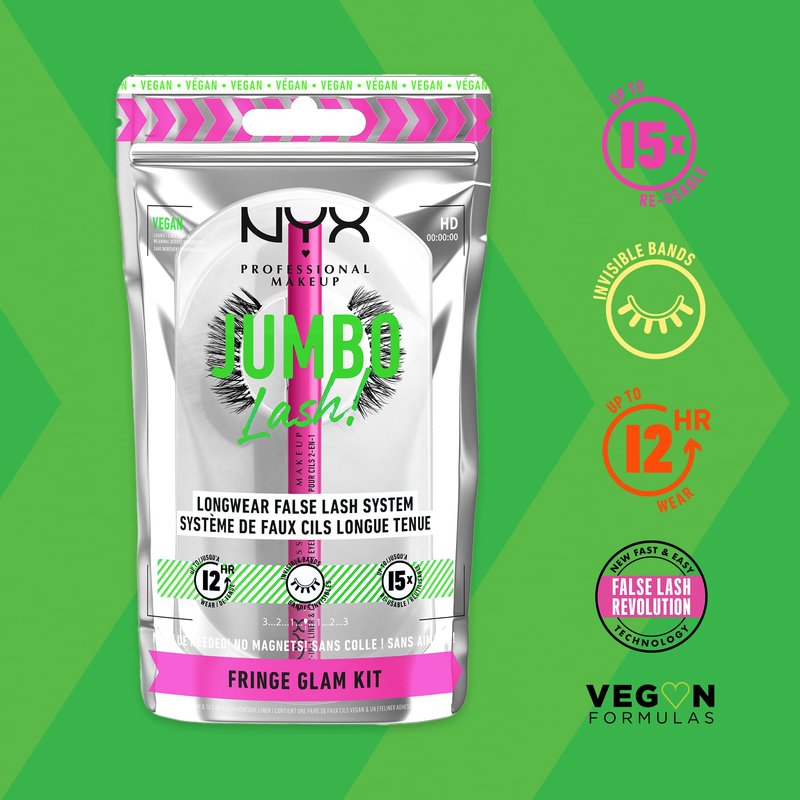 NYX PROFESSIONAL MAKEUP Jumbo Lash! Vegan False Eyelashes Kit with 2-in-1 Eyeliner Adhesive, Up to 12HR Wear, Reusable Fake Lashes - Fringe Glam Kit