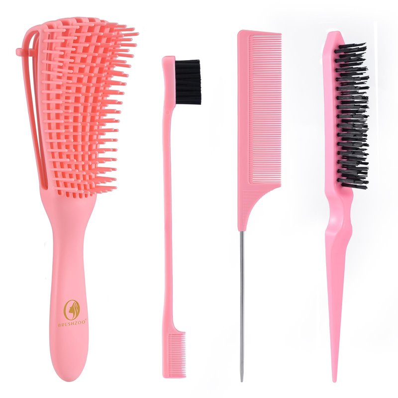 O BRUSHZOO Hair Brush Set with Detangling Brush, Rat Tail Comb, Teasing Trush, Edge Brush (Pink, Curly Hair, Unisex)