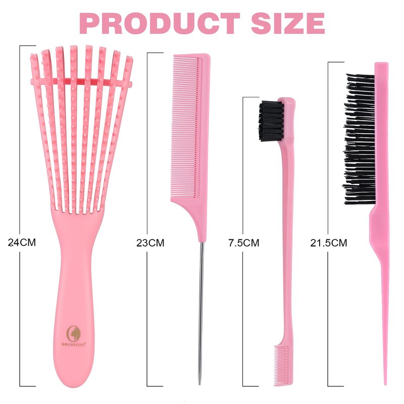 BRUSHZOO Detangling Hair Brush with Hair Styling Comb Set, Hair Brushes for Women Men Kids Curly Hair, Hairbrush Set includ Detangler Brush Teasing Hair Brush Rat Tail Comb Edge Brush (Pink)