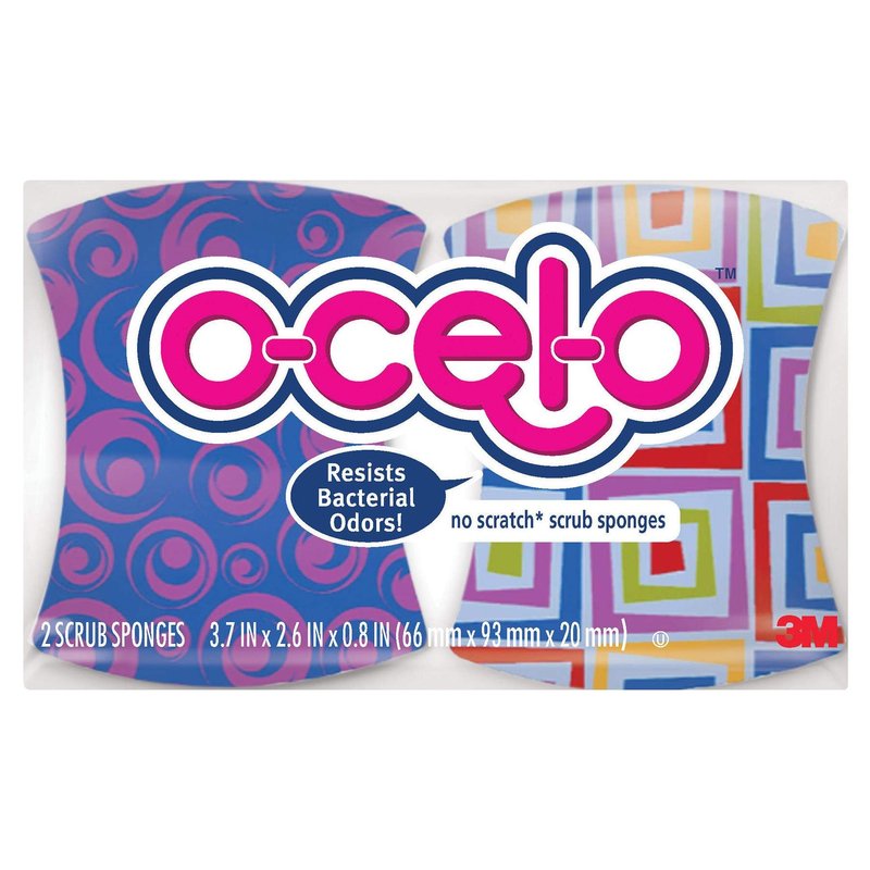 3.7 in x 2.6 in x 0.8 in (9.3 mm x 66 mm x 20 mm). Sassy scrub sponges. Non-scratch, safe on: Non-stick cookware, countertops, tubs, coolers, and more! Ocelo fun. Scotch-Brite function. ocelo.com. Questions? 1-800-846-8887. Scrubbing fibers made from 100% recycled content. Made in Canada for 3M with globally sourced materials.