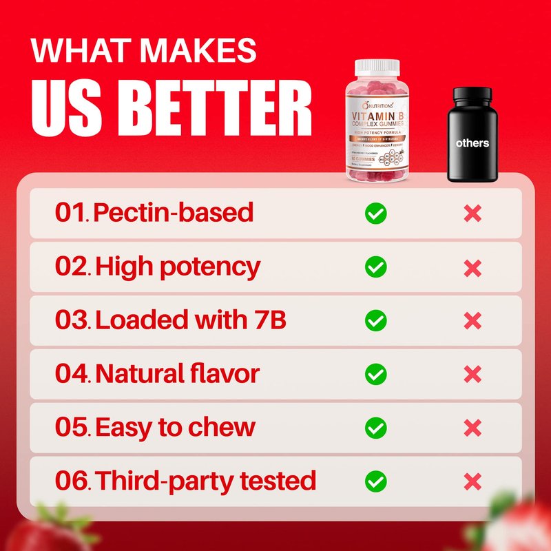- POTENT AND DELICIOUS B-COMPLEX VITAMINS :These delicious gummy are much easier to get your daily vitamin B's compared to swallowing pills. Our formula is so potent you just need ONE gummy a day!
