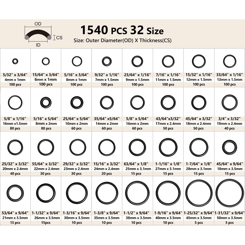 - [Package] : 1540 pcs O ring assortment, contains 32 sizes inner diameter (5/32" ~ 1-9/16") and thinkness (3/64" ~ 9/64").