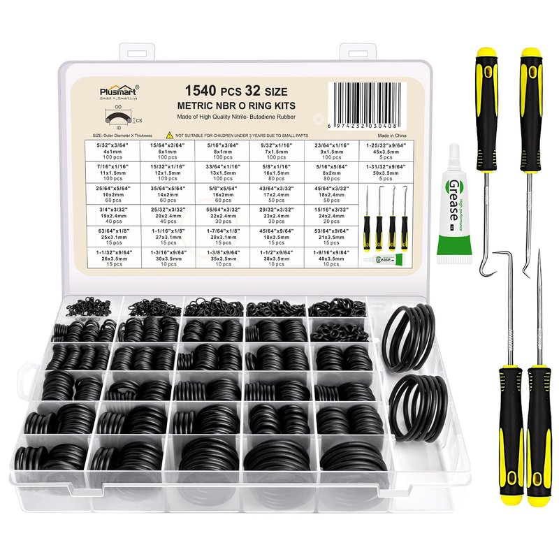 O Ring Kit, 1540 Pcs Rubber O-Ring Assortment Kit, Plusmart 32 Sizes Washer Gasket Set for Pressure Washer, Plumbing Sealing Repair, Air or Gas Connections, Resist Oil and Heat, 4 Tools & 1 Lube Paste
