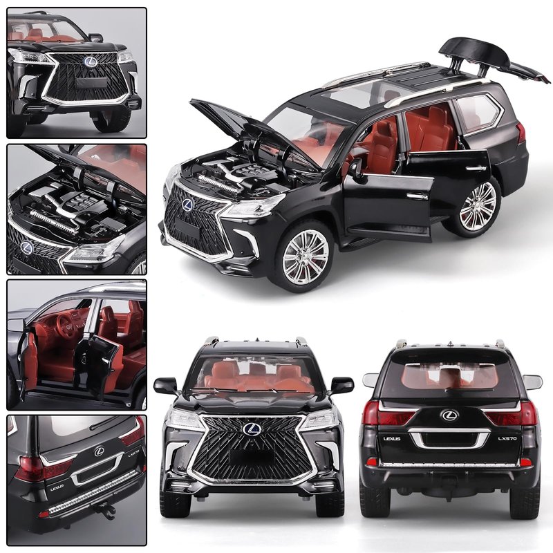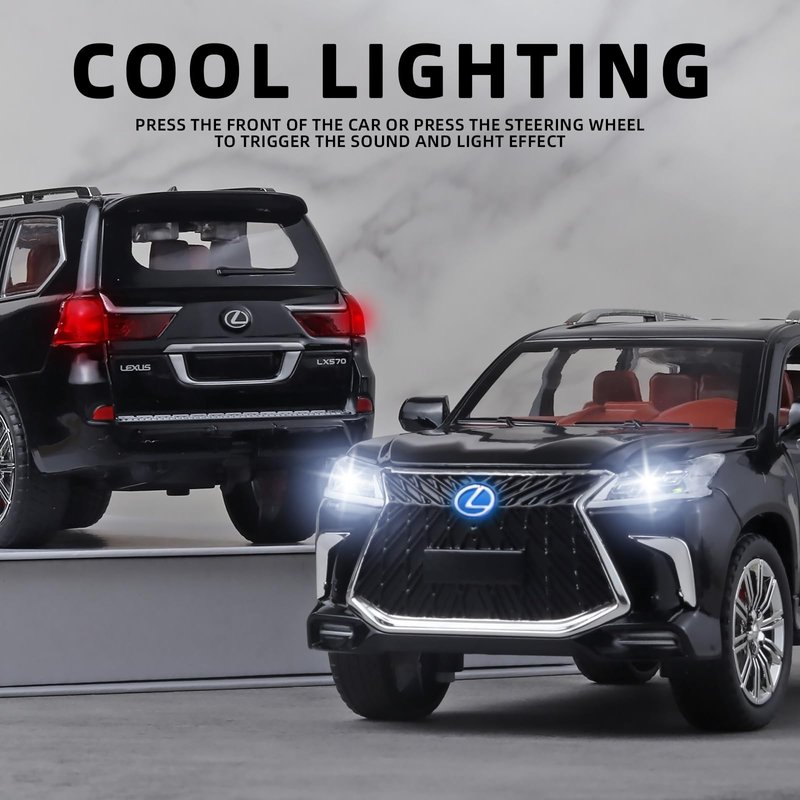 - 2.Black lexus 570 Model Car Material:Die cast metal toy cars,Our toy car is made of zinc alloy + ABS plastic, zinc alloy body, interior and chassis are made of ABS plastic, rubber tires.Toy cars for boys age 4-7.
