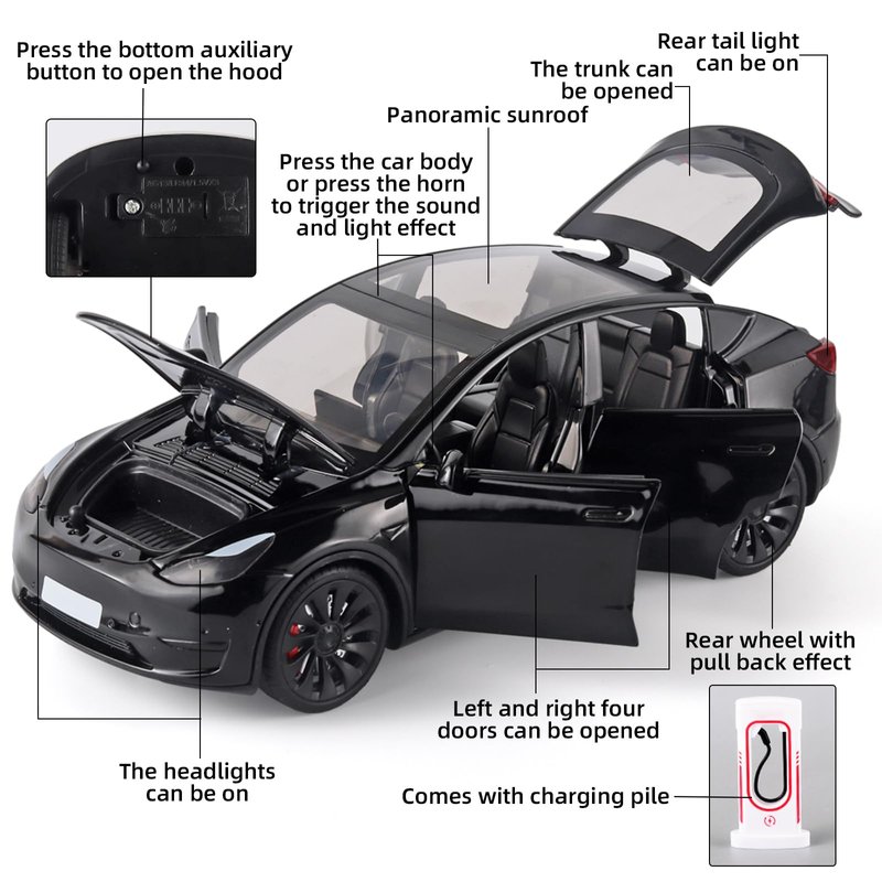 - 3.Black Y Toy Car Function:With simulated sound and light, press the horn and press the body to trigger the sound and light effect, and the headlights and rear taillights can be turned on. The four doors, hood and trunk can be opened, and the rear wheels have a pull-back function.