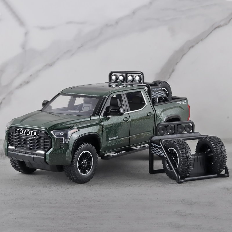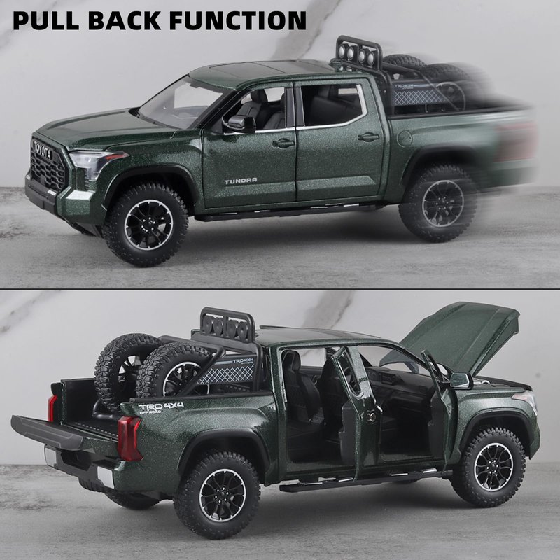Tundra Toy Trucks is made of zinc alloy + ABS plastic, and the zinc alloy body, interior and chassis are all ABS plastic.With simulated sound and light effects,press the body or press the steering wheel to trigger the sound and light effect,the front lights and rear tail lights light up and trigger the sound effect.Doors, hood and tailgate all open,front wheels can turn left and right,the rearview mirror can be folded,retractable pedals on both sides,the tire rack can be freely disassembled.Four wheels with shock absorbing effect,the rear wheel has a pull-back function.Tundra toy pickup truck fine workmanship,very suitable for collection by children or car model lovers, and is the best choice for gift giving.