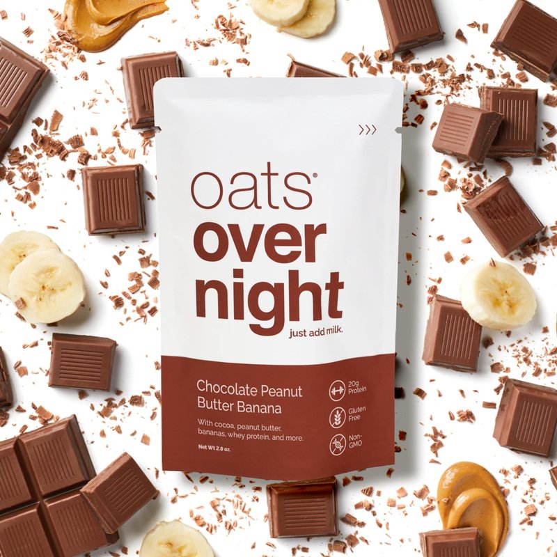 Oats Overnight - Chocolate Peanut Butter Banana oatmeal is the perfect overnight oats breakfast solution for those who are always on the go. With zero morning prep, you can mix one pack of Oats Overnight with your choice of milk substitute (or traditional milk) the night before and place it in the fridge so you can grab and go in the morning with the protein shaker bottle. Ditch the spoon and enjoy this premium oats overnight shake directly from the BlenderBottle (included), perfect for your morning commute. Oats Overnight Chocolate Peanut butter Banana protein shake is a certified gluten-free, kosher, non-GMO oatmeal that is made with real cocoa, peanut butter, diced bananas, chia seeds, flaxseed, and whey protein. This combination of ingredients makes it the best-tasting high protein oatmeal on the market. Each serving contains 22g of protein and is high in fiber, providing an easy start to your morning and helps keep you full for the perfect protein breakfast. With 22g of gluten free oatmeal, it’s also the perfect nutritious overnight oats ready to eat protein oats breakfast or post-workout rolled oats recovery option. Order now and enjoy the convenience of a nutritious oats over night breakfast that’s ready when you are!