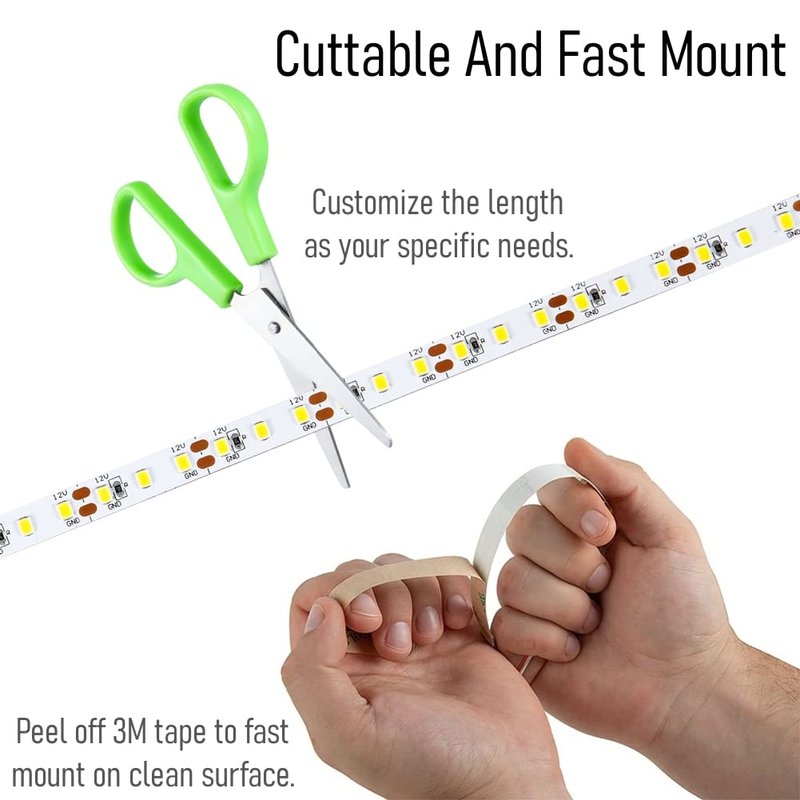- Cuttable & Easy to Install - Cuttable LED strip light allows to customize the length you needs. Installation is simple, peel off 3M adhesive, then attach the strip to a smooth, clean surface