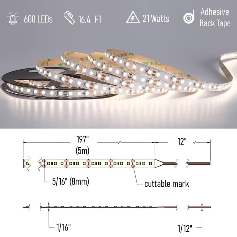 - Strip width 8mm(5/16”), strip length 16.4 ft/5m