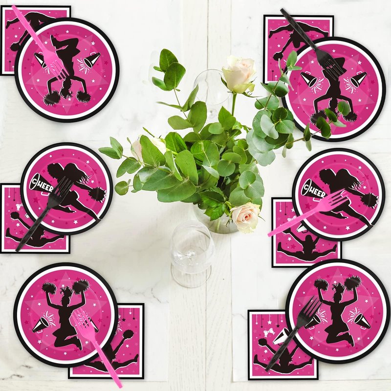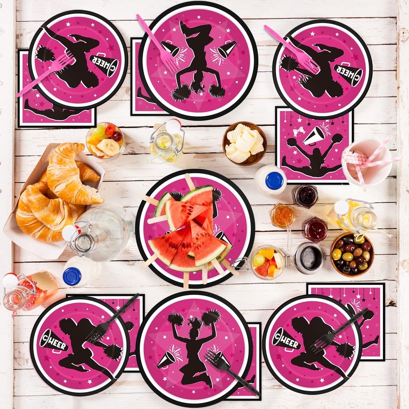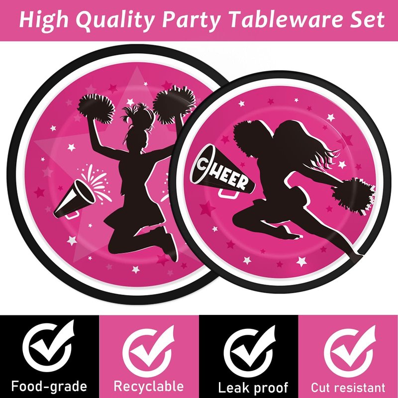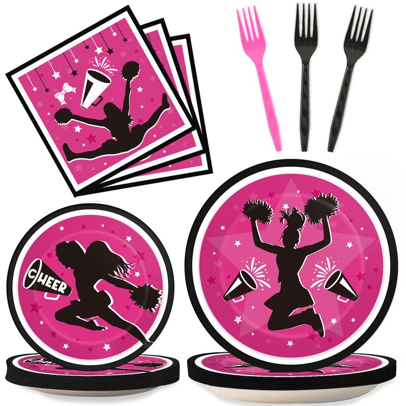 - 【Vibrant Pink Design】Except for the fork, this cheerleader theme party tableware set is all designed in vibrant pink and black cheerleader patterns for girls. Decorating your cheerleading theme party with these tableware kit can make your party full of the festival atmosphere.