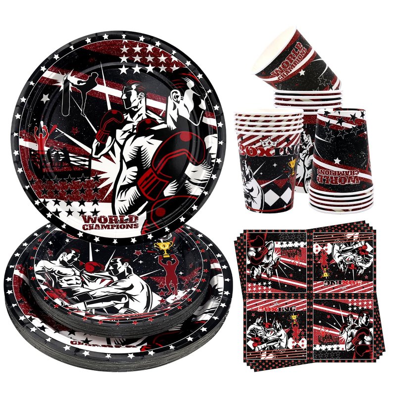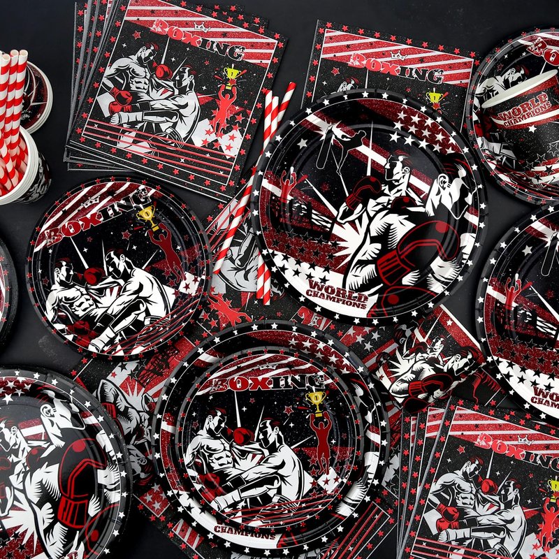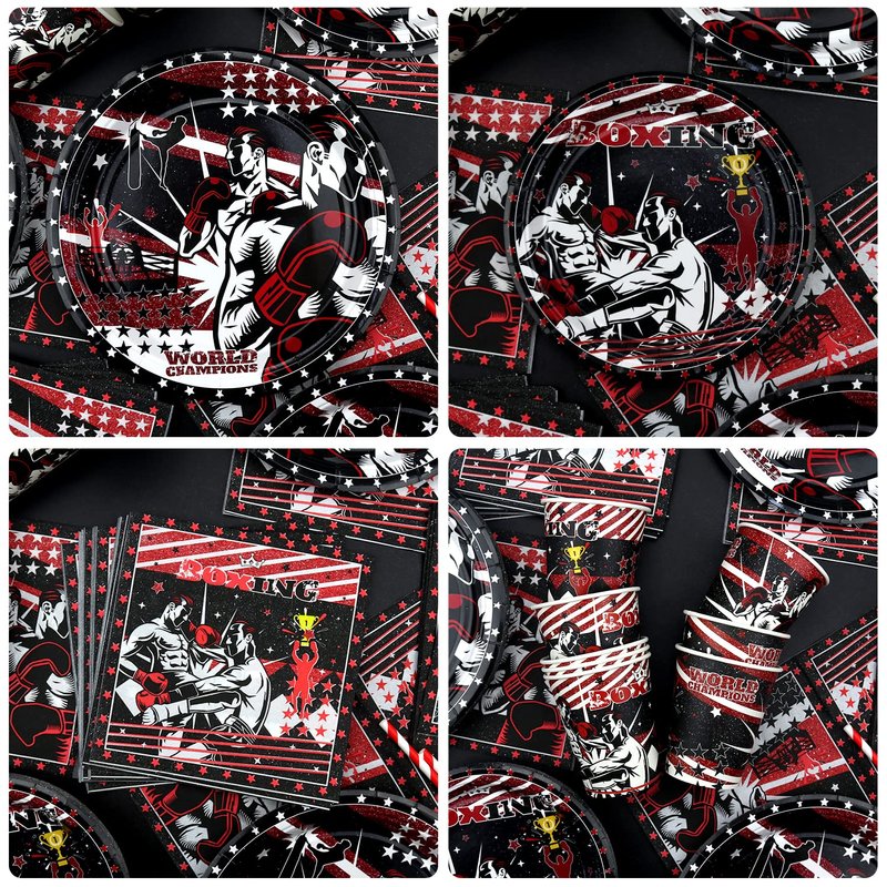 - Well Made: The boxing party tableware set is environmentally friendly, and recyclable heavy-duty paper, which will not fold, tear, or break. ( Note: Do not use microwave ovens to heat plates and cups. )