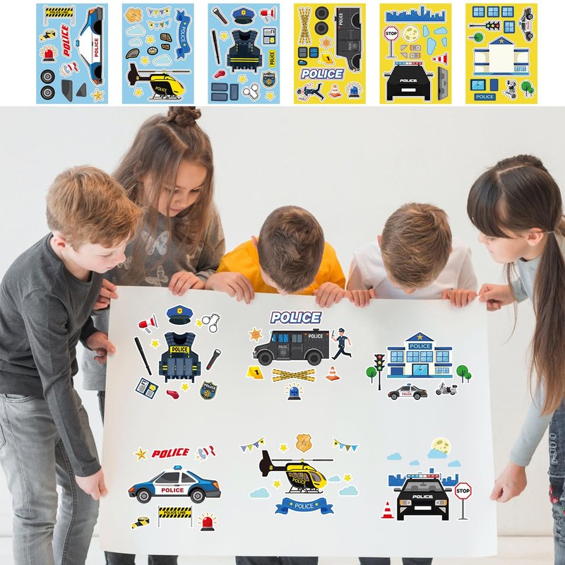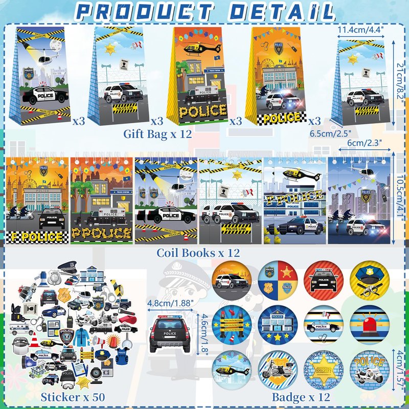 - POLICE GIFT VALUE SET: You will get 12 gift bags, 12 wristbands, 50 luggage stickers, 12 DIY assembly stickers, 12 police themed button badges, 12 police coil notebooks