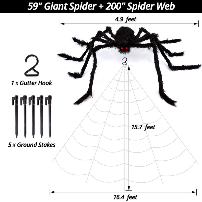 - ☞GIANT & VALUE PACK -- Come with 200" Triangular giant spider web and 59" Halloween spider, huge size make it looks real from far away, great addition for around the house. Placed it in outdoor yards & homes, give your neighbors and friends some surprises! So affordable pack to save time, why not get it?