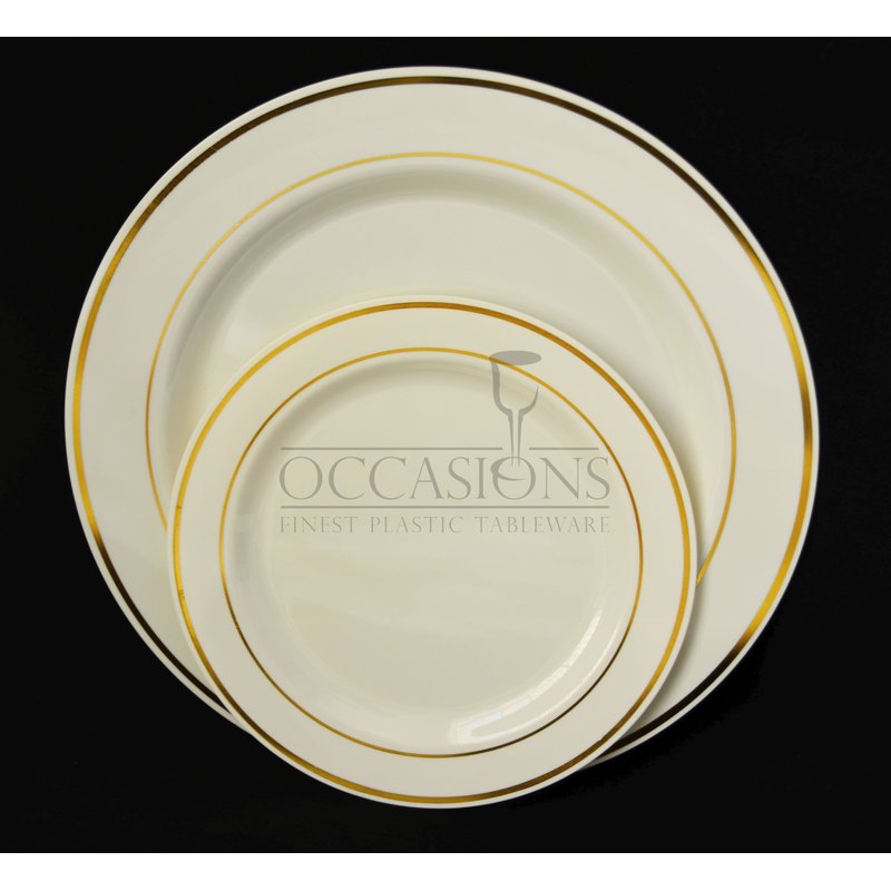 " OCCASIONS " Wedding Party 9'', 7.5'', 6'' disposable plastic plates and silverware combo (60, Bone w/gold rim)